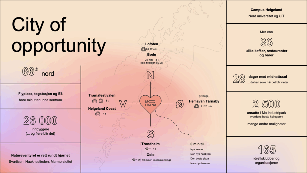 Mo i Rana er en ung by med lyst til å vokse mer. Vi jobber aktivt for å legge til rette for at de som bor her i dag skal trives, og at det skal bli attraktivt å flytte til kommunen.